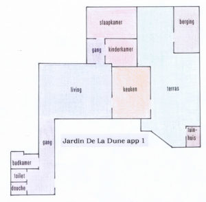 Rechts vind je het grondplannetje van ons appartement met wat extra info ivm de verschillende ruimtes en voorzieningen;